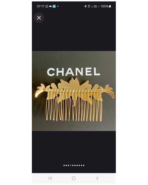 The Chanel Hairclip Comb is a luxurious accessory designed for women who appreciate style and sophistication. Made of gold metal, this comb is the perfect addition to any outfit, adding a touch of glamour to your look. Designed in France by the prestigious brand Chanel, this comb is ideal for all hair types and occasions, making it a versatile and timeless piece for your collection. Perfect for adding a hint of elegance to your everyday hairstyle.