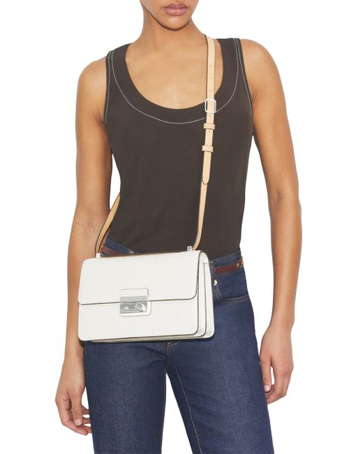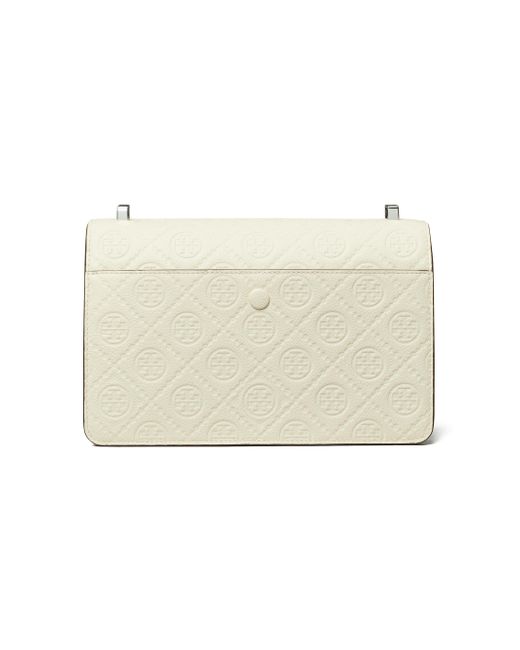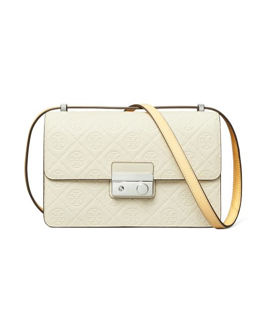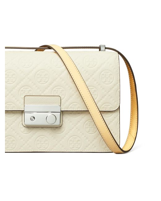 This T Monogram shoulder bag from Tory Burch is crafted of pebbled leather and features signature hardware, a removable strap, and a push-lock closure. Adjustable, removable crossbody strap Exterior: one slip pocket Push-lock closure Interior: one slip and zip pocket Leather Lining: polyurethane/polyamide Imported SIZE About 9"W x 6"H x x 3.5"D Adjustable, removable crossbody strap: about 20.5" drop ABOUT THE BRAND Since debuting her brand in 2004, New York-based designer Tory Burch has made an impact on the fashion world with her handbags and shoes, and playful-yet-polished clothing. Today, Burch remains inspired by color and travel, with her vibrant collections bursting with prints, and her instantly recognizable double-T logo drawing from Moroccan architecture. Handbags - Tory Burch Handbags > Tory Burch > Saks Fifth Avenue. Tory Burch. Color: Warm White.