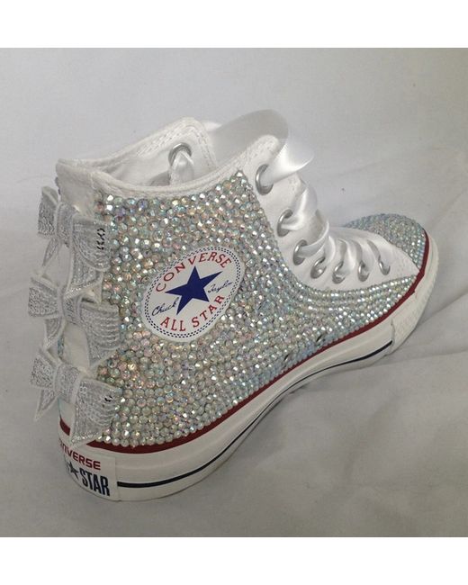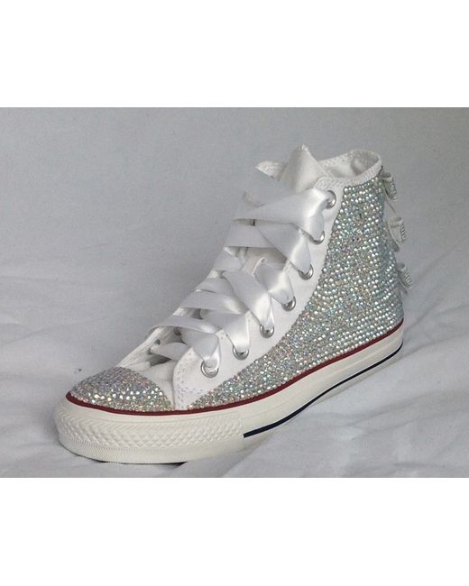 Fully customised Chuck Taylor All Star Converse. Each rhinestone is placed by hand with care with an eye for detail. These hightop sneakers have been beautifully hand customised with AB Crystals stones as per the picture and added sequin bows to the back for the most dazzling effect from every angle.