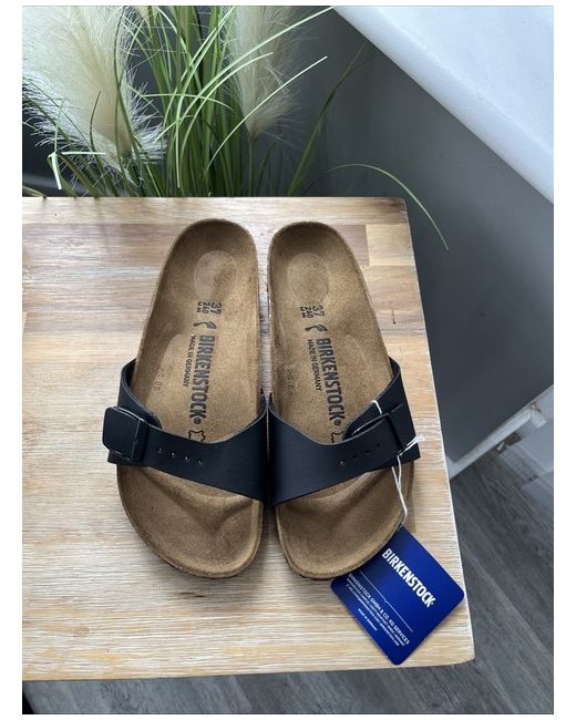 The Birkenstock Madrid BS Black sandals are a stylish and comfortable choice for women looking for a casual and slip-on option. Made in Germany, these sandals feature a flat heel and standard shoe width, perfect for summer wear. The black synthetic upper material and lack of pattern make them versatile for various occasions, while the brand's reputation ensures quality and durability. A must-have for those looking for a reliable and fashionable sandal for everyday wear.