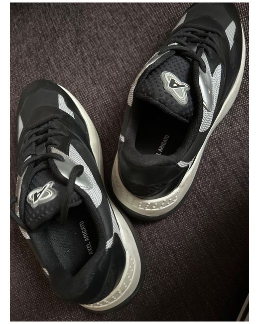 The Axel Arigato Trainers in black, size 6.5, are a stylish and versatile choice for women. Made in Portugal with leather uppers and rubber outsoles, these low-top lace-up sneakers are perfect for casual occasions in the spring season. The standard shoe width ensures a comfortable fit, while the brand's signature sleek design adds a touch of sophistication to any outfit. Perfect for adding a chic and contemporary touch to your wardrobe, these trainers are a must-have for fashion-forward individuals looking for a blend of style and comfort.