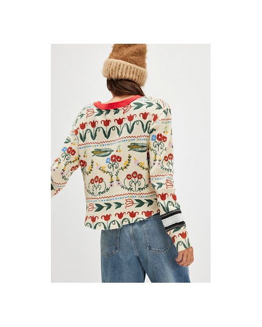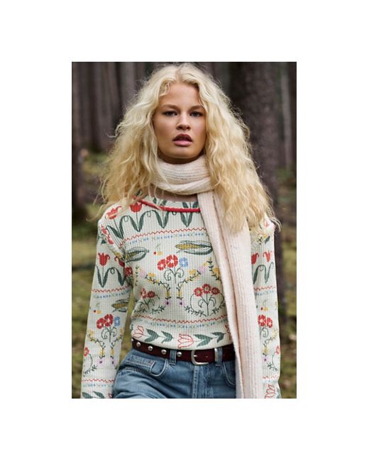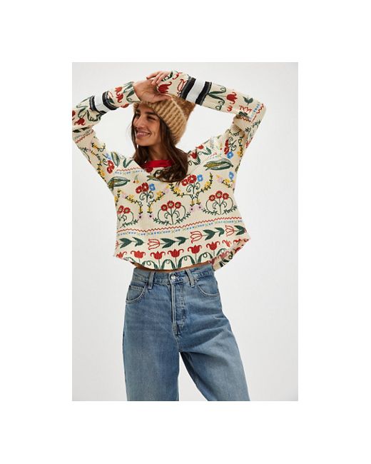 Perfect in print from our We The Free collection, this long-sleeve features a waffle-knit fabrication and relaxed fit with a scoop-neckline and contrast trim. **Fit:** Relaxed fit, classic cut **Features:** Waffle-knit fabrication, scoop-neckline, drop-shoulder sleeves with cuffs, contrast trim, defined seam detailing, printed detail all over **Why We ❤ It:** This printed top adds something unexpected to every layered look. We The Free Blissful Layering Tee at Free People in Corn, Size: Small