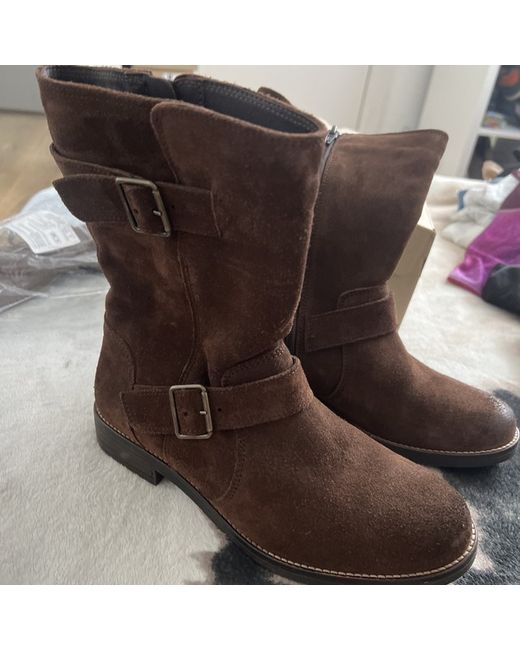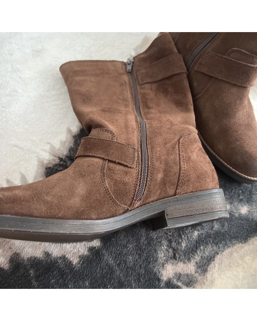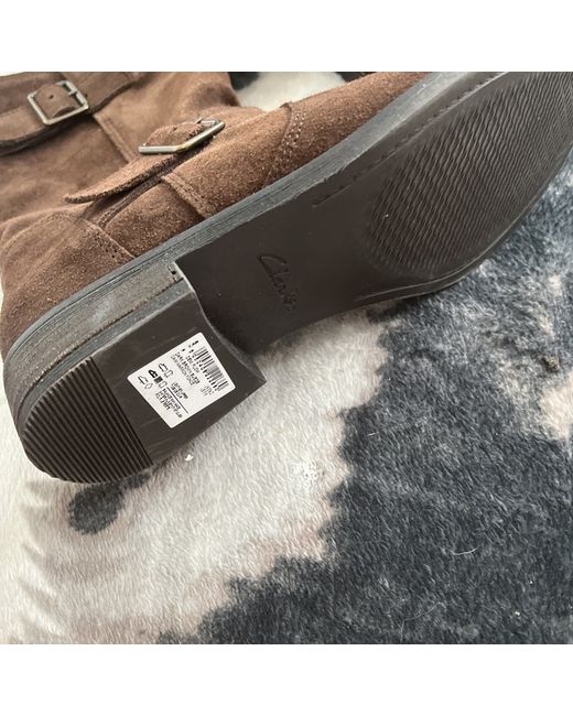 These Clarks Dark Brown Sure Boots in size 5.5 are a stylish and versatile choice for women. The round toe shape and low block heel make them perfect for casual occasions, while the suede upper material adds a touch of sophistication. With the classic Clarks branding and on-trend bootie style, these boots are a timeless addition to any wardrobe. Ideal for adding a touch of elegance to your everyday look, these boots are a must-have for any fashion-forward woman. Clarks rep 120 selling for 49