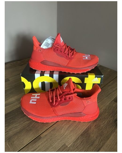 The Adidas NMD Solar Hu Pharrell in size 9.5 Red is a stylish trainer designed for casual occasions. With a low top shaft style and rubber outsole, these sneakers are perfect for summer wear. Featuring the iconic Adidas branding, these trainers are part of the NMD product line and boast a popular red colourway. Released in 2019, these sneakers are the perfect addition to any man's wardrobe, adding a touch of modern style to any outfit.