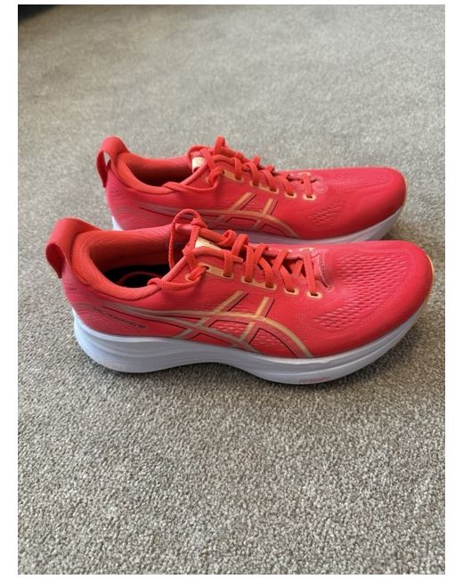 The ASICS Gel Kayano 32 Flash Red trainers are designed for active men seeking style and performance in their athletic footwear. With a striking red colour and standard shoe width, these ASICS Gel Kayano 32s are perfect for gym training, track and field, and running. These trainers offer the signature comfort and support that ASICS is known for, making them a reliable choice for sports enthusiasts and fitness enthusiasts alike. New but without original box. These trainers were purchased for athletic use but do not compliment my gait/pronation. Purchased in error. Purchased directly from ASICS online. Excellent quality shoes with no damage and no marks at all and in perfect condition. Sorted in a cupboard in a clean and smoke-free house. £180.00 RRP.