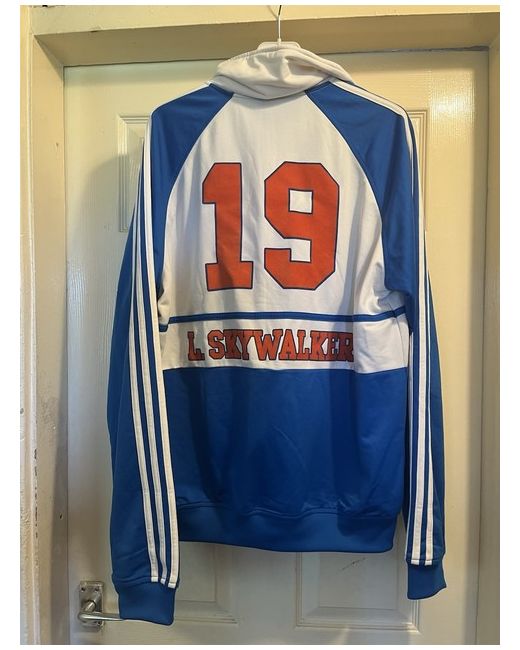 The Adidas X Star Wars Firebird Jack Skywalker Jacket is a stylish varsity jacket featuring a full zip closure and made from polyester material. This blue jacket is machine washable and perfect for casual occasions, with a vintage design that pays homage to Star Wars. The jacket is part of the Adidas Originals product line and is ideal for walking in the spring season. This regular fit jacket is a must-have for any fan of Star Wars and adidas.
