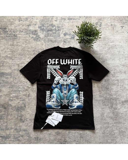 This Men's Authentic Off White Bold Back Print Bunny T-shirt is a stylish and unique addition to any wardrobe. Made from comfortable cotton material, this short-sleeved T-shirt features a round neckline and a regular fit. The bold graphic print of a bunny on the back adds a playful touch, while the black colour and logo accents give it a modern edge. Perfect for any season, this T-shirt is machine washable and brand new with tags, making it a great choice for fashion-forward individuals looking to make a statement.pit to pit is 20 inches.
