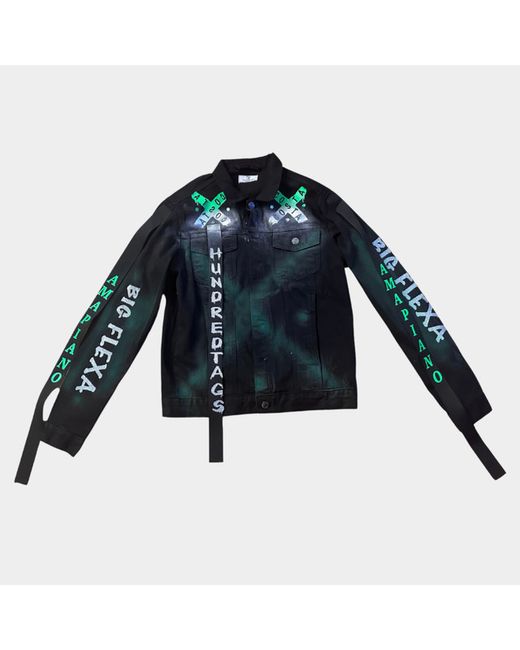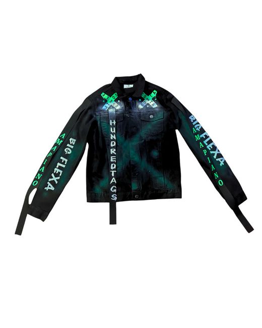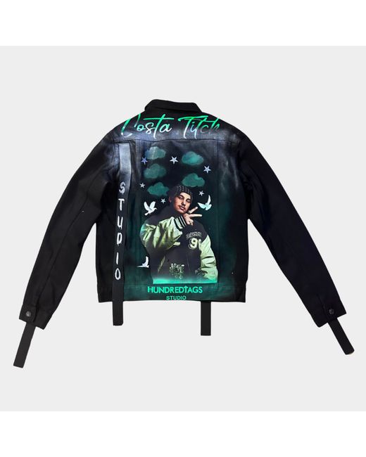 Back panel portrait of Costa Titch with cloud & star effects. Designed aswearable tribute art for Costa Titch fans & collectors. White doves symbolising freedom & tribute. Premium black denim base with hand-painted finishes.