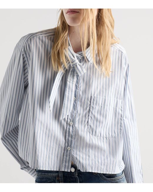 As is true to Prada's identity, this shirt takes on juxtapositions of masculine and feminine codes. A structured poplin silhouette and two-tone stripes offer a nod to classic tailoring, while a bow tie to the collar welcomes an asymmetric detail.