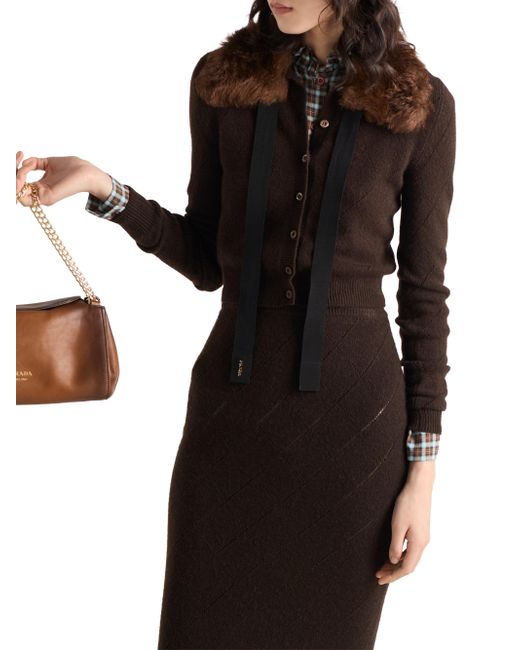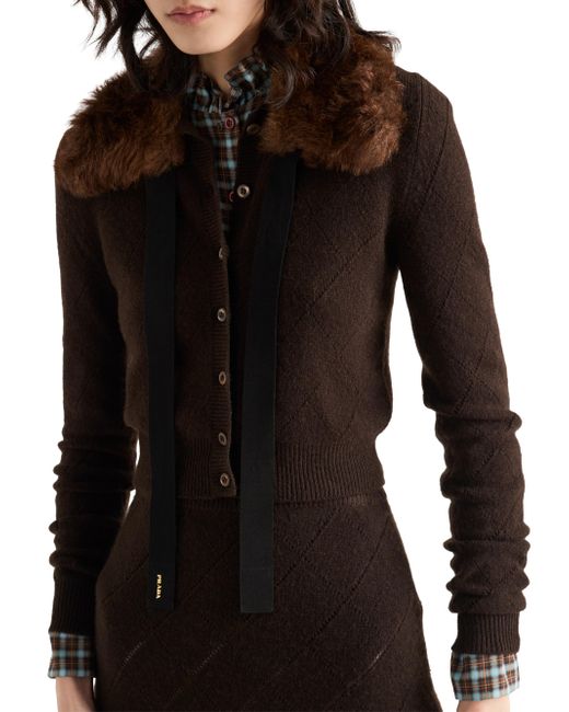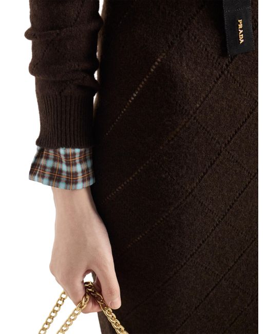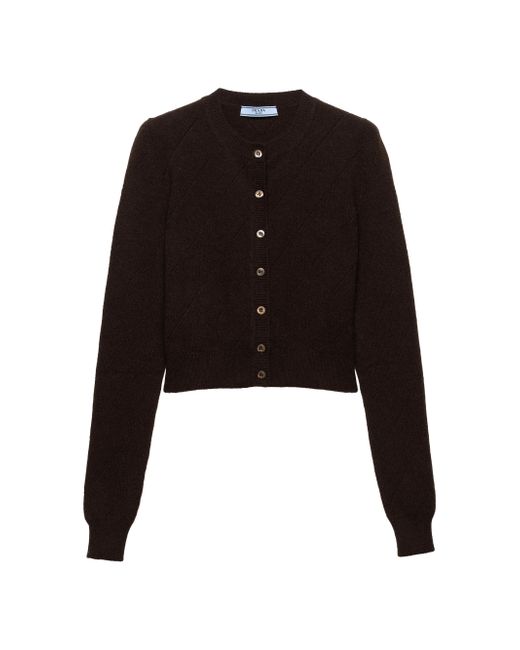 Long sleeves Openwork knit motif Slim fit Ribbed knit crew neck Raglan shoulder Ribbed knit cuffs and hem Knit triangle logo Front button closure Made in Italy 100% Cashmere - 100% Trochus Niloticus. Lsd Rtw - Prada Rtw > Prada > Saks Fifth Avenue. Prada. Color: Brown. Size: 2.