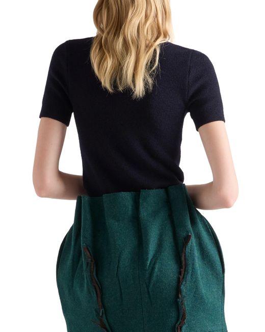 Short sleeves Plain knit Slim-fit silhouette Ribbed knit crew neck Saddle shoulder Ribbed knit sleeve trim and hem Metal and mother-of-pearl pendant Imported 100% Fleece wool - 100% Brass. Lsd Rtw - Prada Rtw > Prada > Saks Fifth Avenue. Prada. Color: Blue. Size: 4.