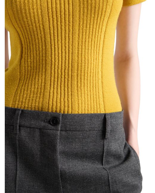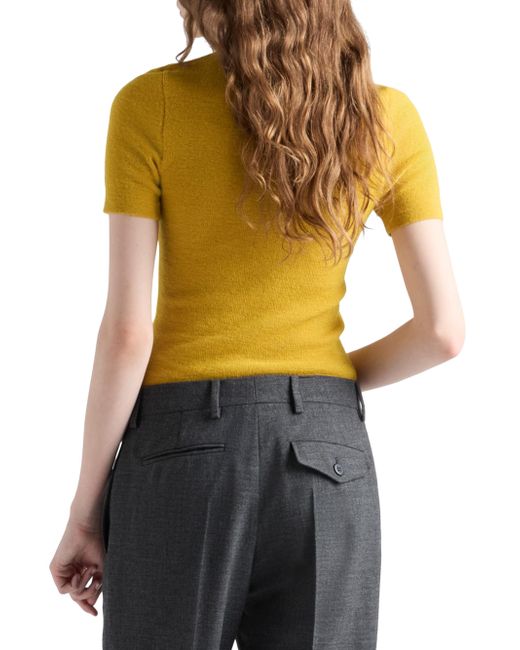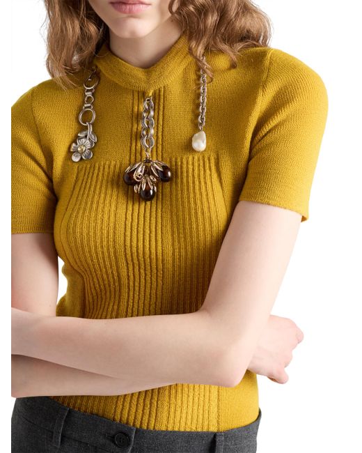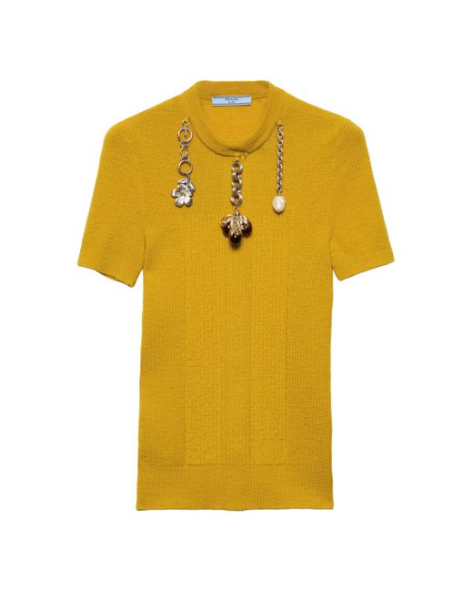 Short sleeves Plain knit Slim fit Ribbed knit crew neck Saddle shoulder Ribbed knit sleeve trim and hem Metal and mother-of-pearl pendants Imported 100% Fleece wool - 100% Brass - 100% Cristaria plicata. Lsd Rtw - Prada Rtw > Prada > Saks Fifth Avenue. Prada. Color: Yellow. Size: 0.