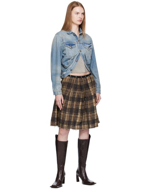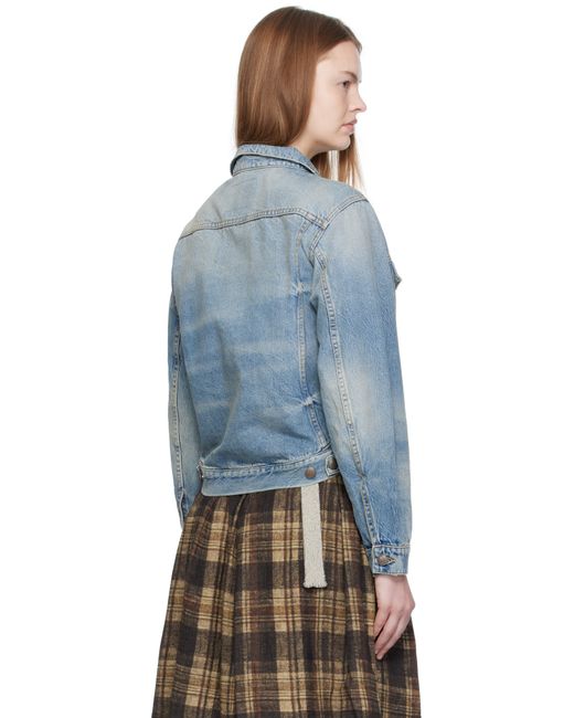 Non-stretch denim jacket. · Fading and subtle distressing throughout · Spread collar · Button closure · Flap pockets at chest · Cropped hem · Darts at curved side seams · Adjustable button tabs at side hem · Buttoned cuffs · Leather logo patch at inner collar · Logo-engraved antiqued copper-tone hardware · Contrast stitching in yellow Supplier color: Merrin blue