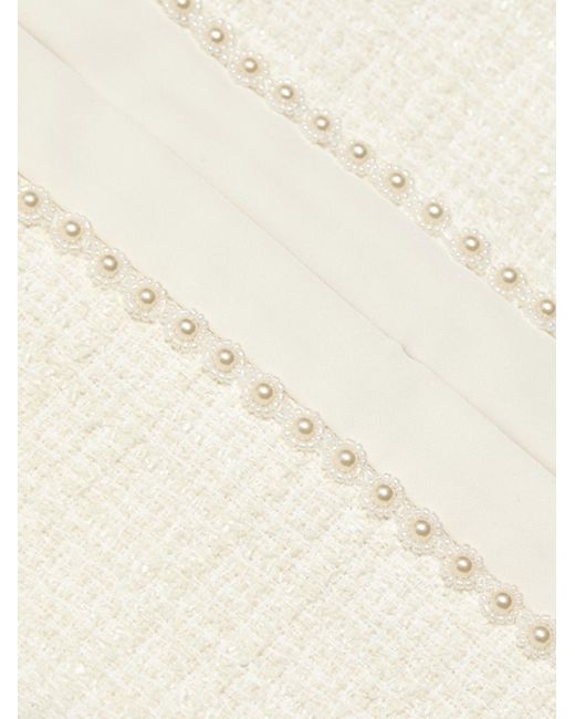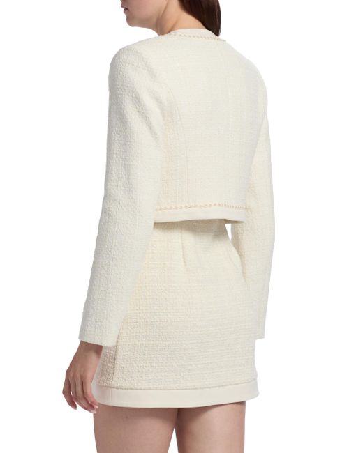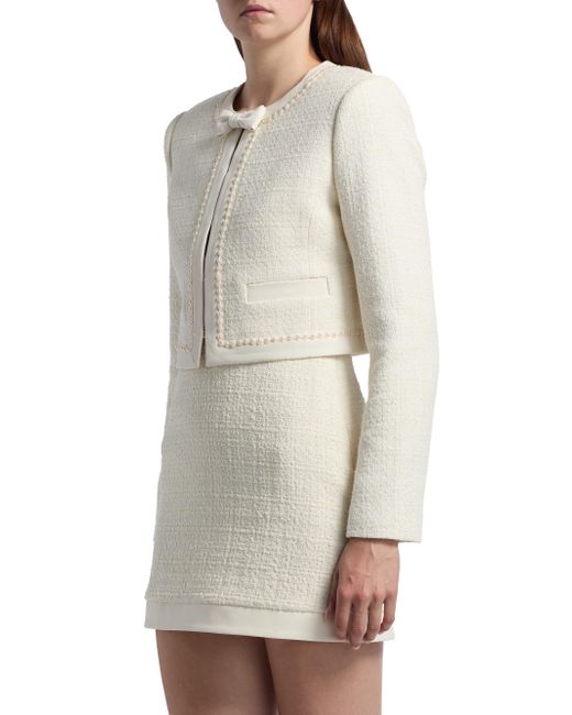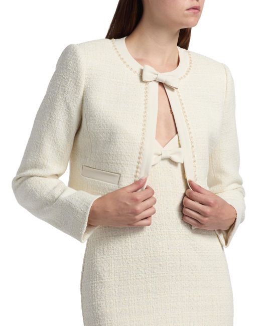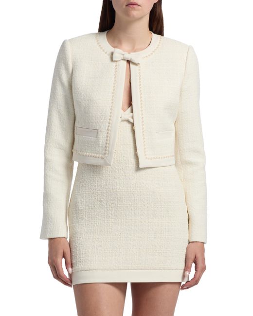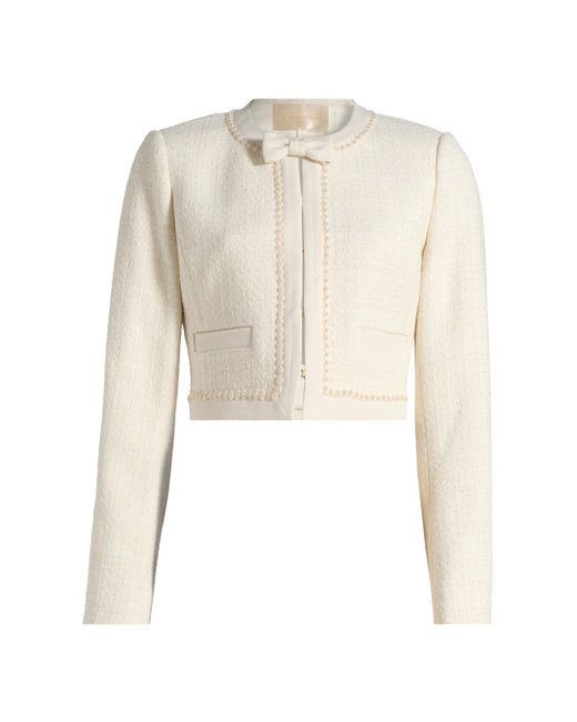 Crafted of luxe Italian tweed, LoveShackFancy's Ralphette jacket features a faux pearl-embellished trim, a bow detail, and long sleeves. Crewneck Long sleeves Front welt pockets Front hook closure 60% cotton/28% polyester/5% acrylic/2% polyamide/5% other fibers Dry clean Made in Italy SIZE & FIT About 24.75" from shoulder to hem Model measurements: 5'10" tall Model is wearing a US size 4. Contemporary Sportswear - Trend > Loveshackfancy > Saks Fifth Avenue. LoveShackFancy. Color: Cream. Size: 0.