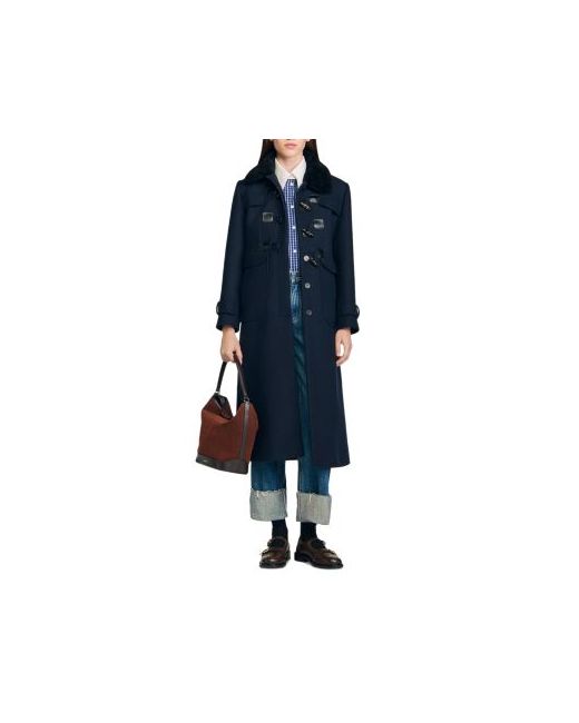 Sandro Long Coat.Color:Navy Blue.Size:34 FR/2 US.Material:Shell: 55% wool/32% polyester/13% polyamide; lining: 100% cotton; removable upper collar: 100% shearling; body lining: 100% viscose.Coats.