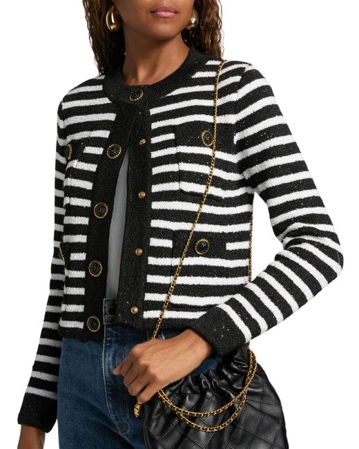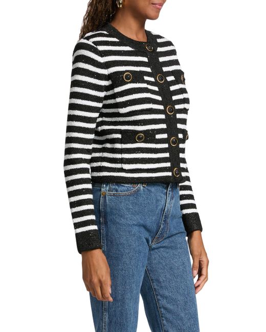 Crafted of a knit blend, Milly's striped cardigan features a sequins and goldtone buttons. Crewneck Long sleeves Front patch pockets Button-front closure 75% polyester/13% polytrimethylene terephthalate/7% wool/5% acrylic Dry clean Imported SIZE & FIT About 20.25" from shoulder to hem Model measurements: 5'10" tall Model is wearing a US size Small. Modern Collections - Milly > Milly > Saks Fifth Avenue. Milly. Color: Black Ecru. Size: XS.
