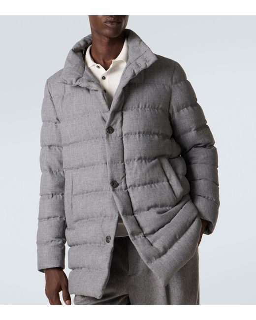 Material: 70% viscose, 30% wool. Care instructions: dry clean. Made in Armenia. Designer color name: Grigio Perlato. Item color: gray. Lining: 100% viscose. Lining II: 100% polyamide. Filling: 100% polyester. Filling II: 80% down, 20% feathers. Trim: 90% polyester, 10% elastane. Coating: 100% polyurethane. Contains non-textile parts of animal origin. Closure: buttoned front, two-way zipped front. Pockets: snap-buttoned pockets, internal pockets.
