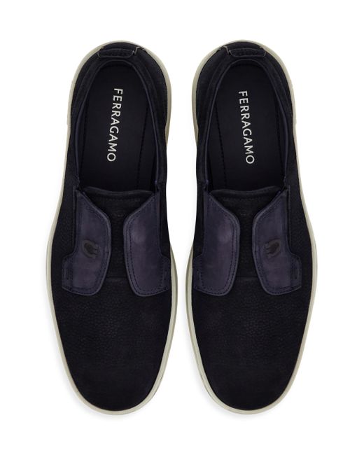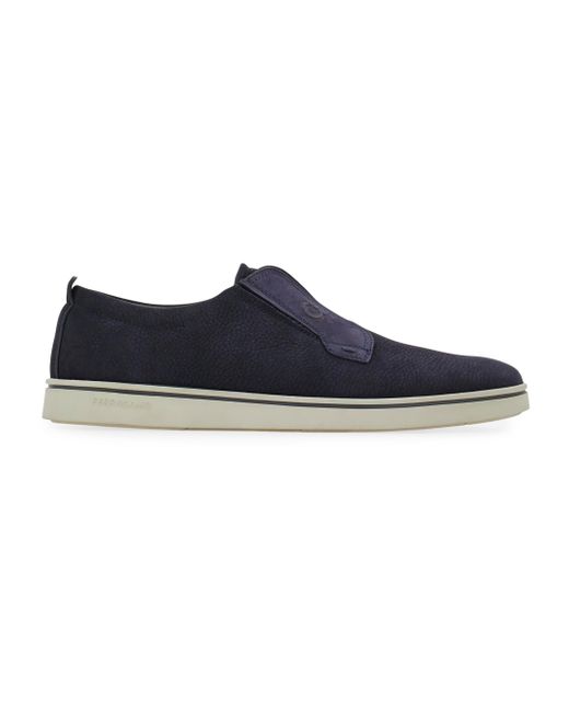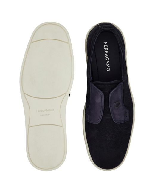 Crafted of soft suede in Italy, FERRAGAMO's Alfie loafers are designed with a layered vamp detailed with topstitching and the label's signature horseshoe. Almond toe Slides on Suede upper Leather lining Leather sole Made in Italy ABOUT THE BRAND Italian designer Salvatore Ferragamo began his journey in 1927 with a vision of creating the world's most beautiful shoes. The label expanded to menswear in the 1970s, and remains famed for its made-in-Italy pieces. The craftsmanship inherent in its shoes is also found in accessories like sunglasses, belts and ties. The brand's signature Gancini logo-a backwards horseshoe-can be found on its classic loafers and fine leather goods. Men's Shoes - Ferragamo Mens Shoes > Ferragamo > Saks Fifth Avenue. FERRAGAMO. Color: Navy. Size: 8.