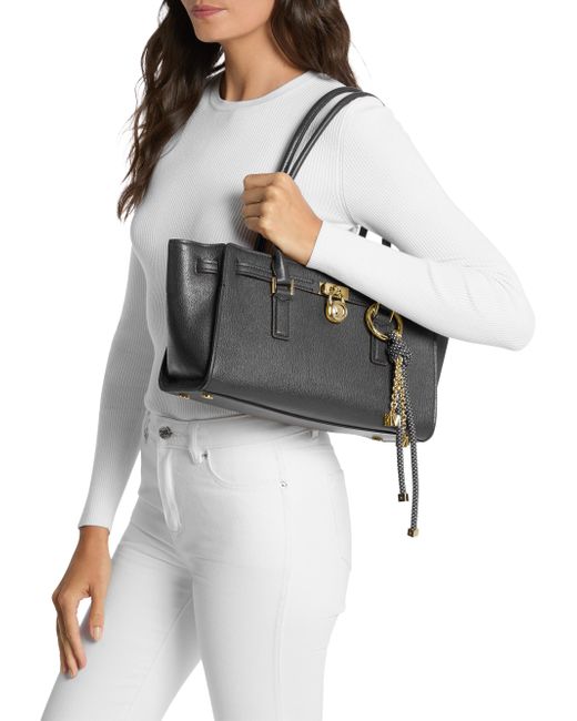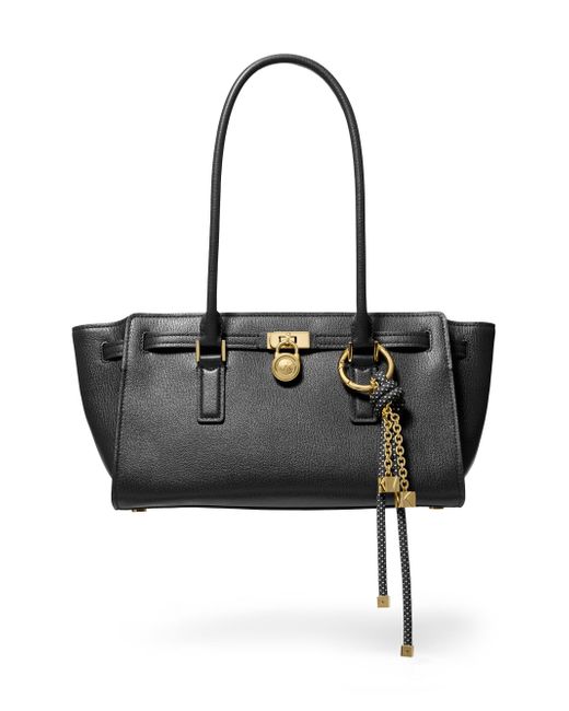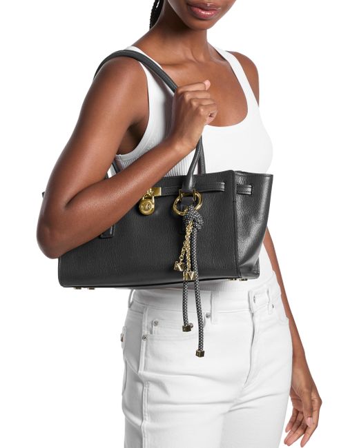 The Hamilton Moderne tote bag from MICHAEL Michael Kors is crafted of polished leather and styled with goldtone hardware and a decorative key chain. Top handle Interior: one slip pocket Top zip closure Leather Imported SIZE About 13"W x 7"H x 4.75"D Top handle: about 9.5" drop ABOUT THE BRAND Since launching his eponymous brand in 1981, Michael Kors has been taking the fashion world by storm with his luxury accessories and ready-to-wear. With multiple labels under his name, Kors' designs remain glamorous and effortless-and now include jewelry, handbags, shoes and eyewear. Handbags - Contemporary Handbags > Michael Michael Kors > Saks Fifth Avenue. MICHAEL Michael Kors. Color: Black.