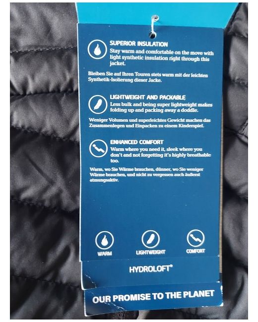 Berghaus Womens Nula NH Hydroloft Lightweight Warm Jacket Colour Black Size UK 14 Stay warm and comfortable on the move with light synthetic Hydroloft® Polyball insulation right through this jacket. Less bulk and being super lightweight makes folding up and packing away a doddle. Slim fitting thanks to micro baffles and breathable. It contains bluesign® approved fabrics to help our planet so you know you’re making a more sustainable choice. Outer and Filling 100% Polyester Lining 100% Polyamide New With Tags