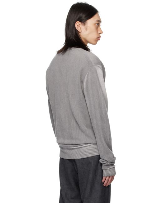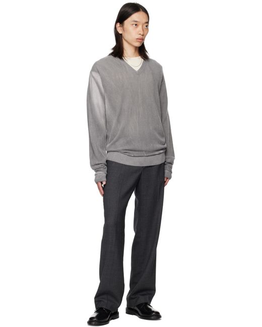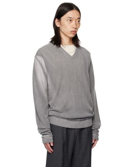 Knit merino wool sweater. · Fading throughout · Rib-knit V-neck, hem, and cuffs · Rolled edge at hem Supplier color: Grey spray dye