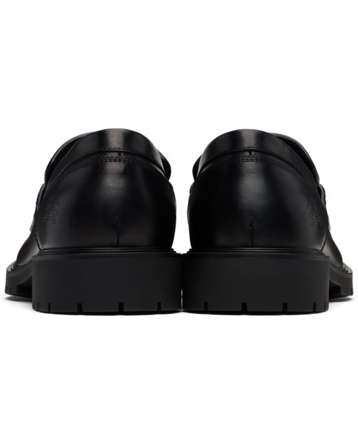 Buffed calfskin loafers. · Moc toe · Strap with cutout and inset logo hardware at vamp · Logo embossed at outer side · Treaded rubber sole Supplier color: Black
