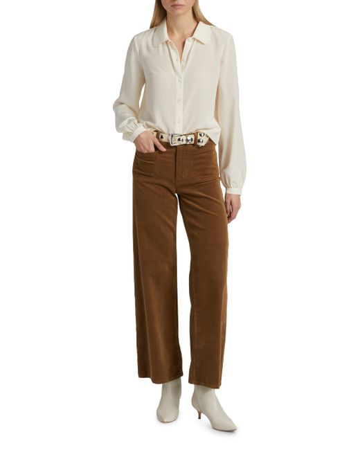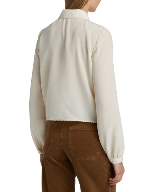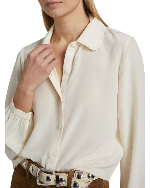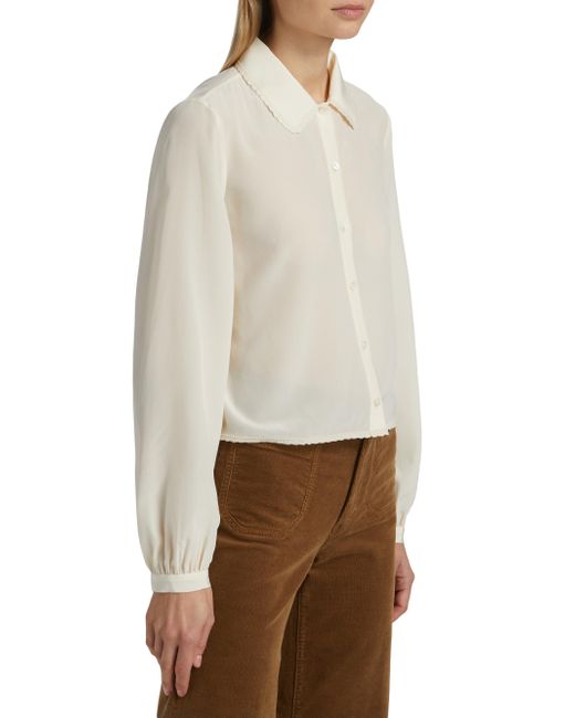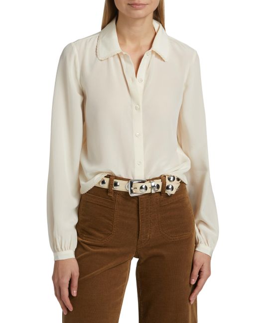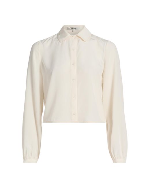 Crafted of silk, this Prim button-front blouse from Frame features a lace-trimmed Peter Pan collar. Peter Pan collar Long sleeves Button-front closure 100% silk Dry clean Imported SIZE & FIT Model measurements: 5'10" tall Model is wearing a US size Small ABOUT THE BRAND In 2012, Erik Torstensson and Jens Grede combined their California-modern point of view with a European sensibility to establish Frame. The ready-to-wear label, first known for its denim, has expanded to leather, cashmere and tailoring-all with an effortless ethos at the core. Focusing on quality fabrics and foundational dressing, the brand delivers chic everyday staples favored by Hollywood starlets and beyond. Contemporary Sportswear - Denim And Bottoms > Frame > Saks Fifth Avenue. Frame. Color: Cream. Size: XS.