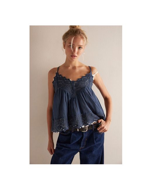 This cami from Intimately is featured in a lightweight cotton-blend fabrication with lace detailing for a touch of femme. **Fit:** Billowy, shapeless silhouette **Features:** Cotton-blend fabrication, subtle V-neckline, racerback adjustable straps, scalloped trim and detailing throughout **Why We ❤ It:** Layer with your favorite lacey bralette for a romantic look. Fiona Cami by Intimately at Free People in Vintage Indigo, Size: XS