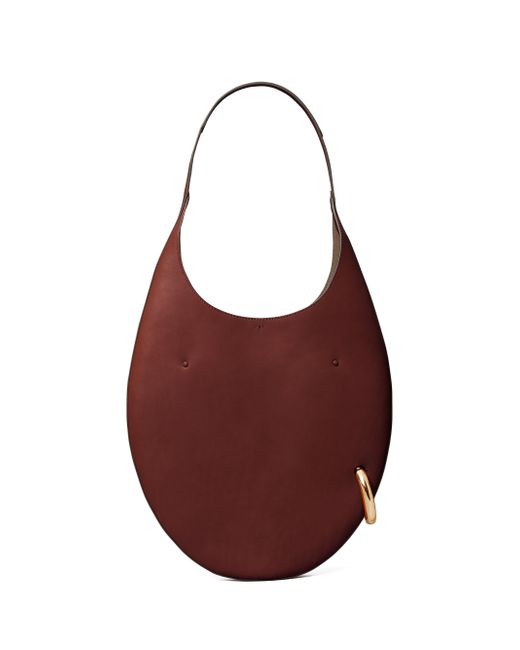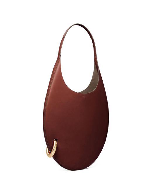 Crafted of leather, this Pierced shoulder bag from Tory Burch features an interior zip pocket and a goldtone ring accent. Shoulder strap Interior: one zip pocket Tie closure Leather Lining: leather Imported SIZE About 12.3"W x 17.7"W x 1.4"D Shoulder strap: about 11.5" drop ABOUT THE BRAND Since debuting her brand in 2004, New York-based designer Tory Burch has made an impact on the fashion world with her handbags and shoes, and playful-yet-polished clothing. Today, Burch remains inspired by color and travel, with her vibrant collections bursting with prints, and her instantly recognizable double-T logo drawing from Moroccan architecture. Handbags - Tory Burch Handbags > Tory Burch > Saks Fifth Avenue. Tory Burch. Color: Dark Cabernet.
