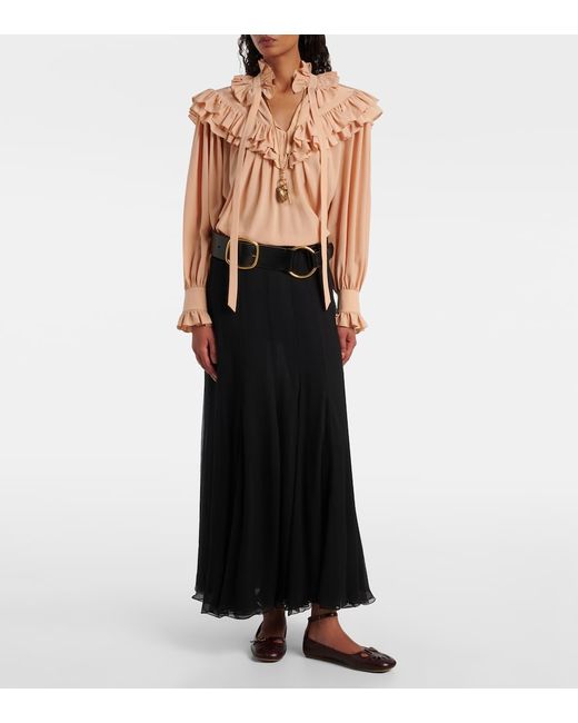 Material: 100% silk. Care instructions: dry clean. Made in Madagascar. Designer color name: Sand Brown. Item color: pink. Lining: 76% acetate, 24% silk. Silk. Cuff: ruffled, buttoned. Self-tie collar.