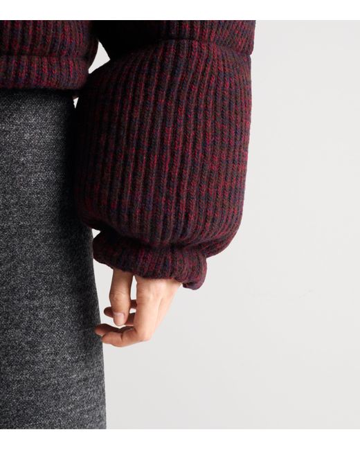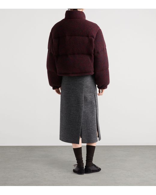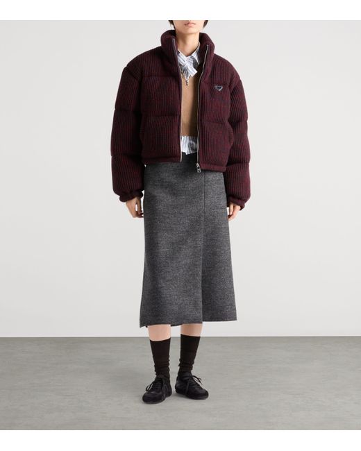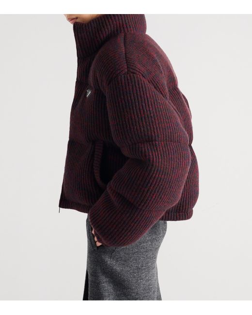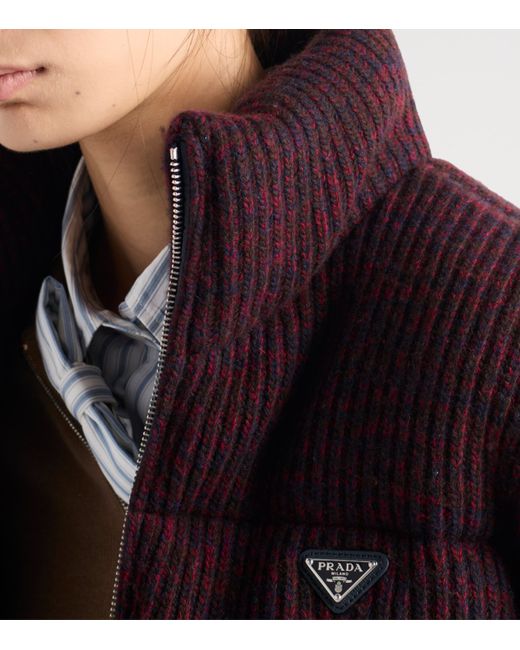 Wrap yourself in the warmth of Prada's outerwear with this padded down jacket, crafted from a soft, insulating blend of fleece wool and cashmere. The knitted design features multicoloured yarns that echo the brand's signature knitwear, while the iconic Triangle logo accents the chest.