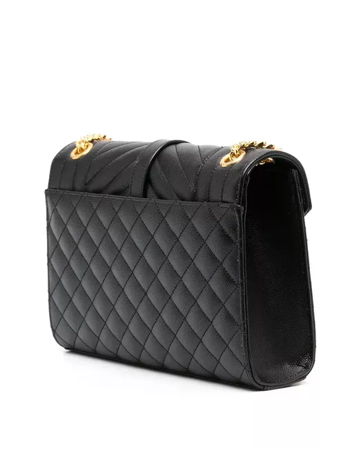 black calf leather quilted gold-tone hardware monogram plaque foldover top with magnetic fastening adjustable leather and chain-link shoulder strap