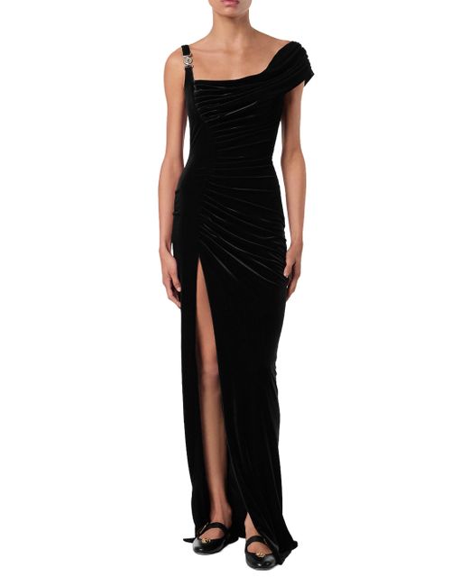 Crafted of luxe Italian velvet, Versace's draped column gown features an asymmetric neckline, alluring side slit, and signature Medusa coin accent. Asymmetric neck Fixed straps Side slit Concealed back zip closure 85% nylon/15% elastane Lining: 100% viscose Dry clean Made in Italy SIZE & FIT Model measurements: 5'10" tall Model is wearing a US size 4 ABOUT THE BRAND Founded in 1978, Versace is instantly recognizable by the signature Medusa head logo, chosen by founder Gianni Versace for its Greek symbolism. The Italian label is known for its luxe, bold clothing and accessories-think gilding, oversized logos and punchy prints. Since taking over artistic direction, Gianni's sister Donatella Versace has maintained the brand's strong identity, with a renewed vision to give customers the ultimate freedom to express themselves. Advanced European - Versace > Versace > Saks Fifth Avenue. Versace. Color: Black. Size: 2.