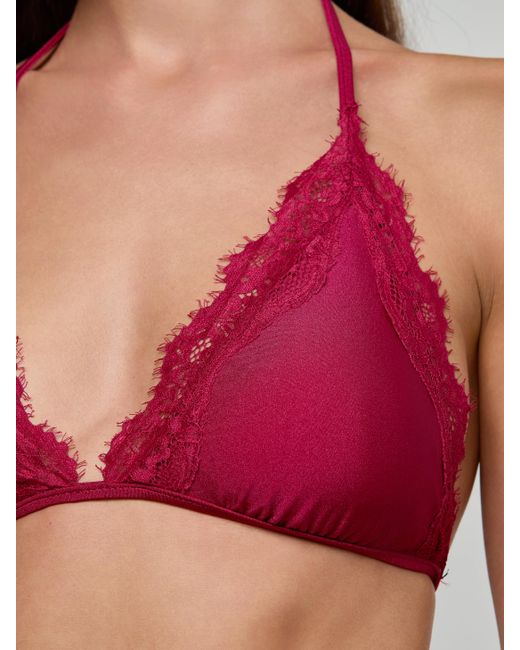 The Annabelle triangle top is feminine and flattering, now updated with boudoir-inspired lace trims that elevate its classic silhouette. Adjustable ties ensure the perfect fit every time, while gold logo cord ends add a luxe finishing touch. A timeless piece made to mix, match, and love season after season.• Four-way stretch nylon• Removable cups• Adjustable ties L'AGENCE Annabelle Triangle Bikini Top In Black Cherry