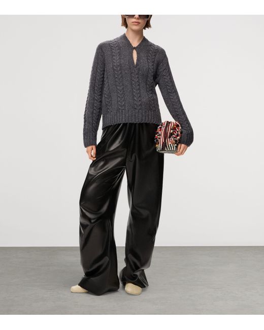 For loewe's collection of knitwear, it often updates traditional styles - here, the classic cable-knit wool sweater - with something a little extra special. Look closely at the button that clasps the neckline to form a keyhole cut-out and you'll see the brand's famed Anagram motif, a subtle but potent symbol of quality.