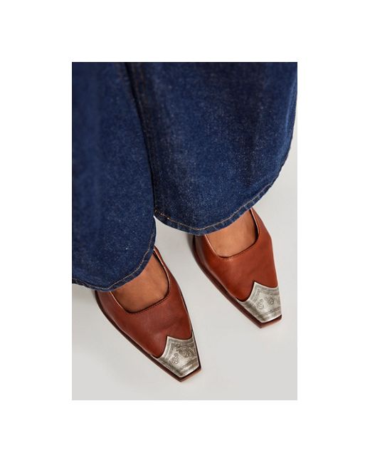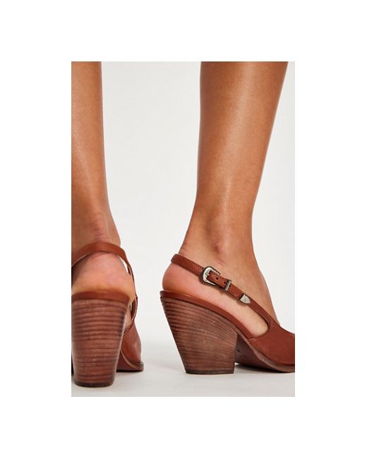 So stunning and lightly inspired by your favorite western boots, these slingback heels from FP Collection feature smooth leather uppers, a metal buckle detail, and an intricate, etched metal toe for a distinct silhouette. * Leather uppers * Covered toe * Slingback heel style with an adjustable buckle * Stacked heel Brayden Slingback Heels by Free People in Sunbaked Brown, Size: US 7