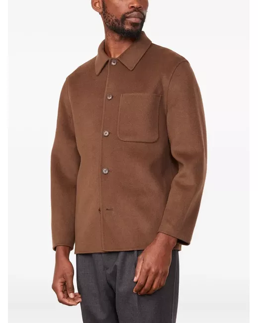 brown wool material button fastening patch pocket collared neckline long sleeves