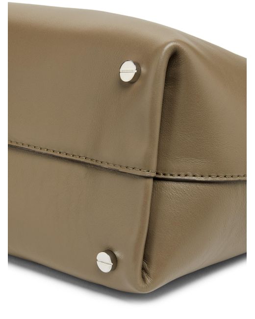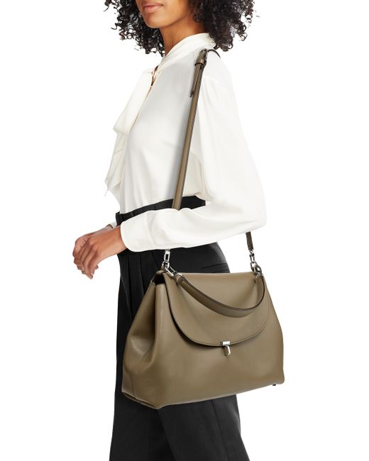 A new, timeless addition to the Toteme T-Lock offering, the classic satchel is reimagined with a slouched silhouette. Crafted in Italy from smooth leather, it has a detachable and adjustable strap and a detachable top handle so it can be carried across the body, from the shoulder or hand. Removable top handle Adjustable, removable shoulder strap Interior: one slip pocket Top flap, clasp closure Leather Lining: 60% polyurethane/ 40% nylon Made in Italy SIZE Top handle: about 8" Shoulder strap: about 15.3'' drop About 16"W x 10.25"H x 5.5"D. Handbags - European Collection Hdba > Toteme > Saks Fifth Avenue. Toteme. Color: Taupe.