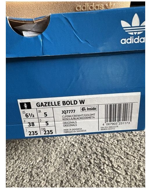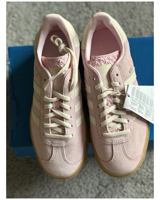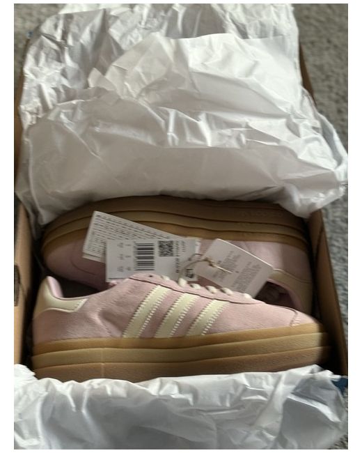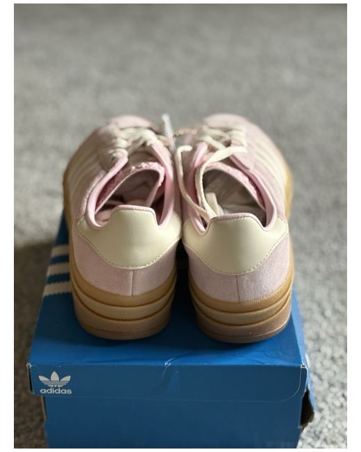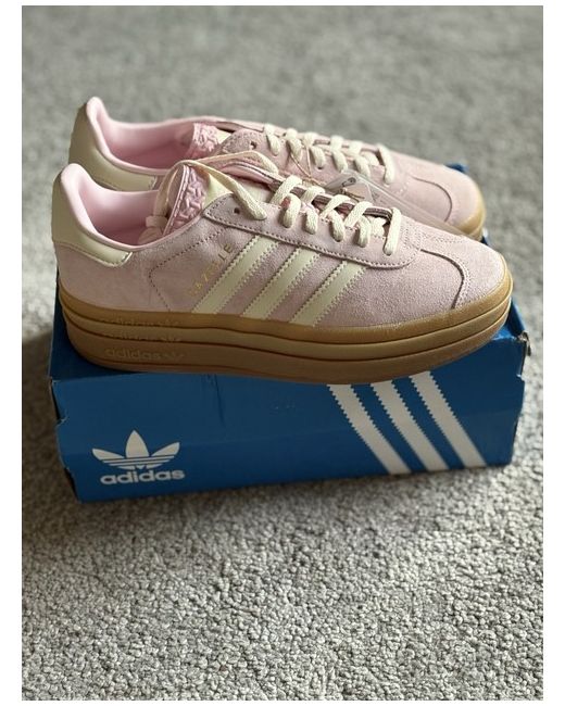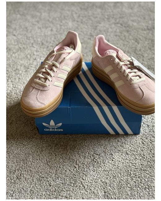 The product is a pair of ADIDAS Gazelle Bold trainers for women in size 5. The trainers are in a stylish pink colour with a leather upper and synthetic sole, Perfect for women who want to make a bold statement with their footwear, these trainers combine fashion and functionality in one sleek design.