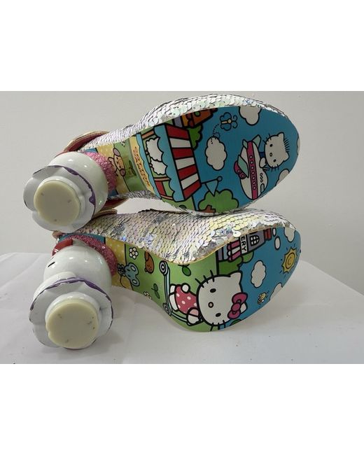 The product is a pair of Hello Kitty heels from Irregular Choice in UK size 5. These multicoloured court shoes feature a round toe and come in a standard shoe width. With reversible sequin fabric these shoes are perfect for Hello Kitty fans looking for a unique and fun addition to their wardrobe. Made from synthetic material, these character heels are a playful choice for women looking for a statement piece in their shoe collection. Brand new never even tried on.