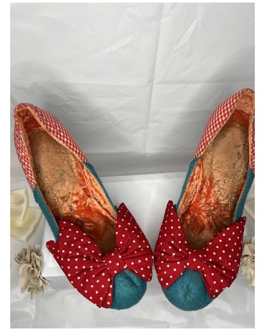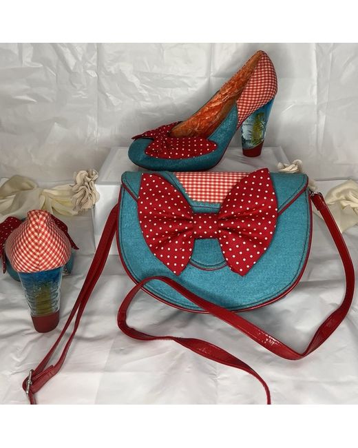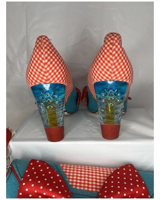 Step into quirky style with this Irregular Choice Flick Flack set – includes both the iconic heels and matching bow bag. 👠Shoes: • Style: Flick Flack • Size: UK 6 (EU 39) • Design: Turquoise with red gingham check, oversized bow, and clear heel with floral detail. 👜 Bag: • Matching turquoise & red bow bag with adjustable strap. • Completes the look – a true Irregular Choice statement piece. ✨ Condition: • Excellent pre-owned condition worn once – minimal signs of use bag never used . • Colours bright, heels sturdy, bag in great shape (see all photos).