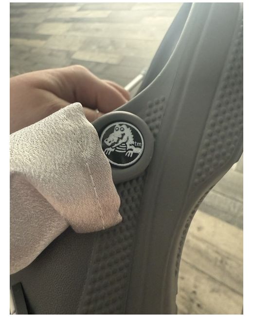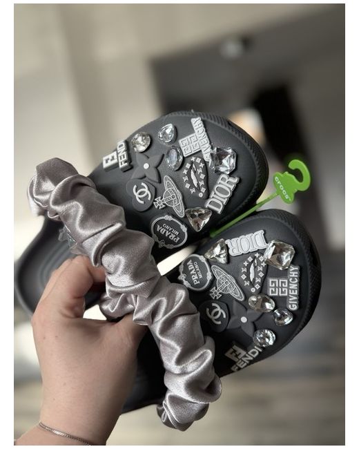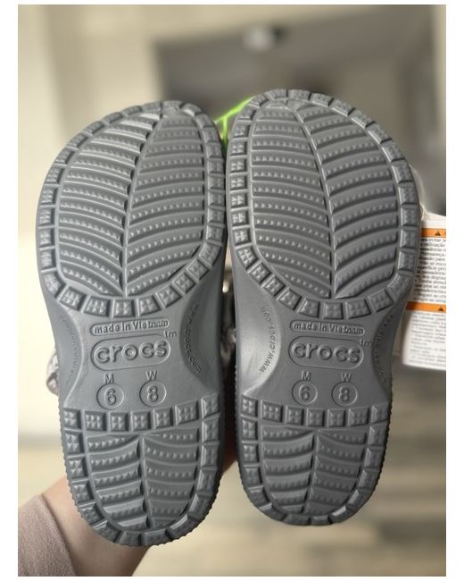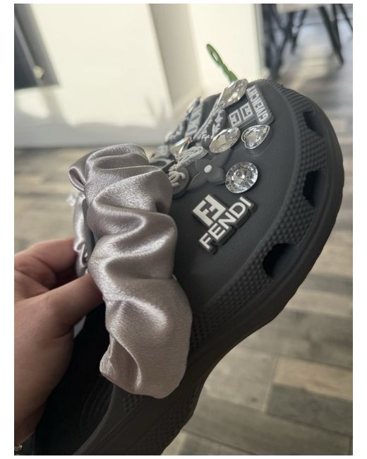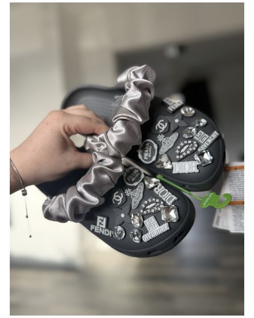 Brand new with original tags and packing (bag NOT BOX) classic crocs In grey In UK size 6 Customised with silver/grey silk strap and grey and silver designer charms/gibbets. Guaranteed postage within 24 hours Of placing your order Message me if you have any questions