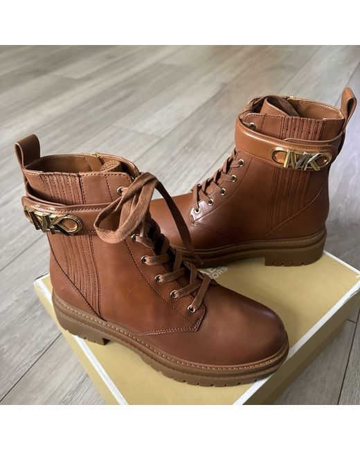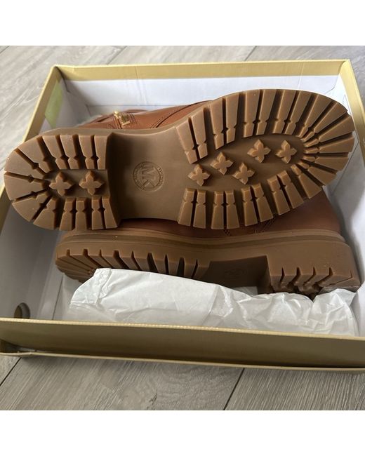 The Michael Kors Women's Boots in size 5 are stylish ankle boots with a round toe shape, perfect for casual occasions. Made from leather with a signature logo accent, these Chelsea style boots are a versatile option for winter wear. The brown colour and standard shoe width make them a flattering and practical choice for everyday wear. The Michael Kors brand adds a touch of luxury to these fashionable boots, making them a must-have for any woman's wardrobe.