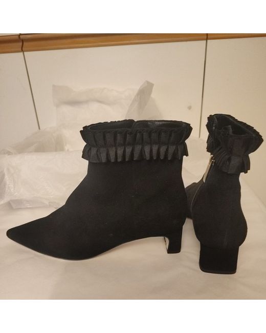 L K Bennett Saskia Black Suede Booties Ruffle Size 39 UK6 Beautiful L K Bennett black suede low heel booties A beautiful pair of booties in a practical heel height with a stunning ruffle They are side zip fastening & have a heel height of 40mm The boots are called SASKIA New , in box , never worn