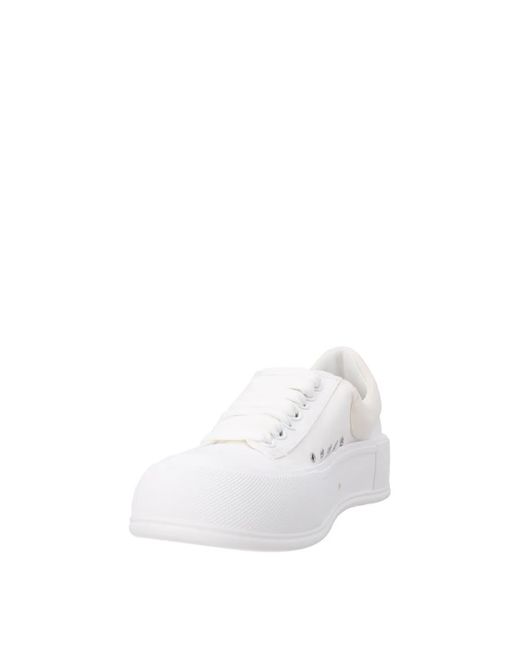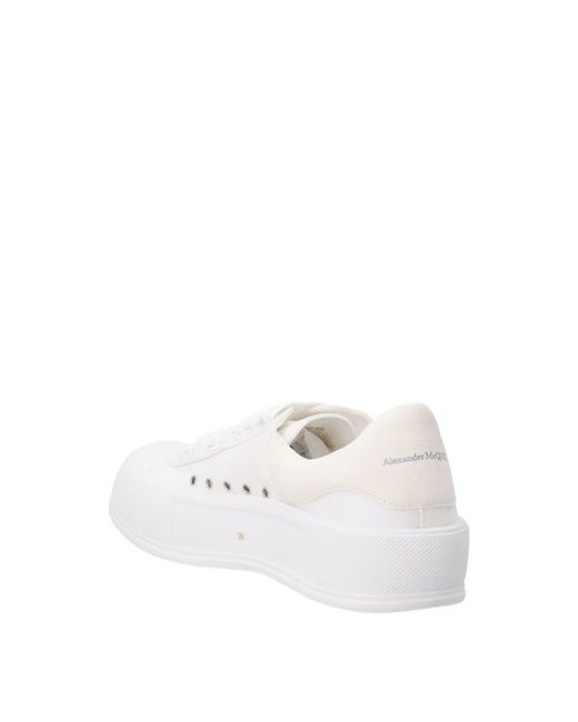 Ladies Alexander McQueen Deck sneakers in white, low top design. Features a fabric upper with rubber outsole and a stylish 45 mm heel. Perfect for casual wear, these lace-up shoes are crafted in Italy for women, size EU 39.5.