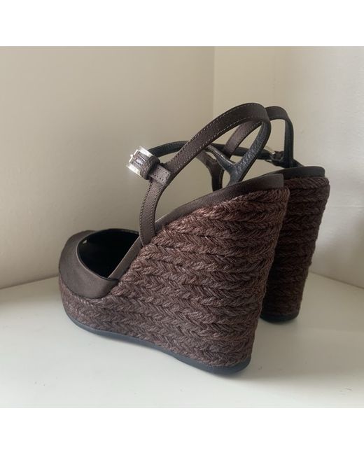 The Prada Satin Peep Toe Wedge Heels are a stylish and elegant choice for any party or cocktail event. Made in Italy, these brown heels feature a leather lining and outsole, with a satin upper material that adds a touch of luxury. The peep toe design and wedge heel style give these shoes a modern and chic look, perfect for the spring season. With a UK shoe size of 3.5 and EU shoe size of 36, these PRADA heels are a must-have addition to any woman's wardrobe.