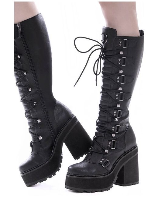 Selene Boots. - Easy Access Side-Zip. - 5"/12cm Platform. - Buckle + Lace-Up. - Moon Hardware. - Faux Leather.