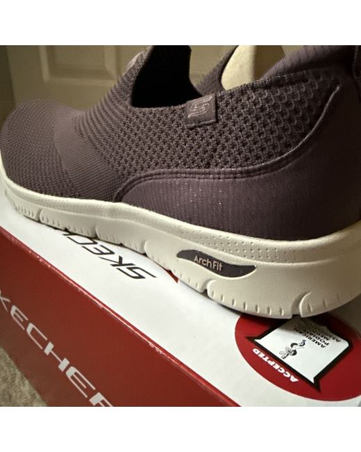Brand new with original box Plum colour Size UK 7 The Skechers Arch Fit Refine 2.0 Cascade Textile Women's Trainers in Plum, UK size 7, are a slip-on style activewear trainer with a wedge heel design. Made from comfortable textile material with a polyester lining, these trainers feature an EVA outsole for durability. The black colour and standard shoe width make them a versatile sneaker option for women who value both style and comfort in their footwear. Perfect for casual wear or light exercise, these Skechers trainers offer a reliable fit and support for all-day wear.