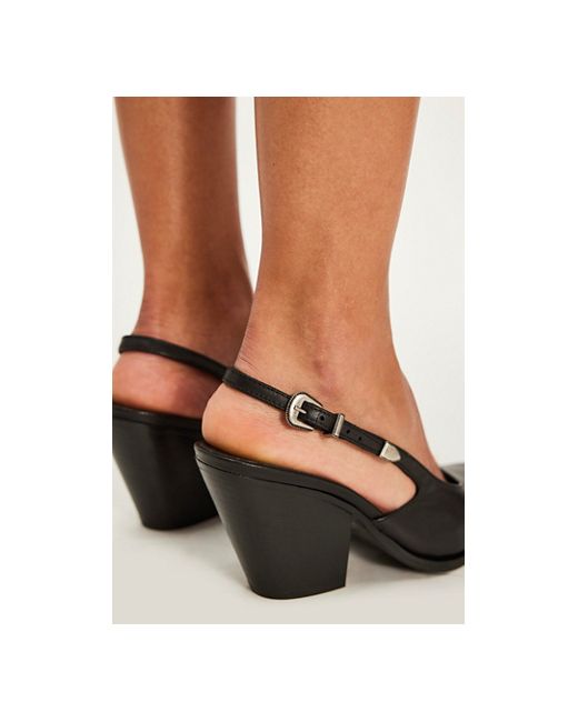 So stunning and lightly inspired by your favorite western boots, these slingback heels from FP Collection feature smooth leather uppers, a metal buckle detail, and an intricate, etched metal toe for a distinct silhouette. * Leather uppers * Covered toe * Slingback heel style with an adjustable buckle * Stacked heel Brayden Slingback Heels by Free People in Black Tide Leather, Size: US 7