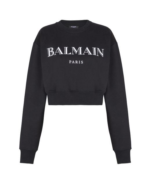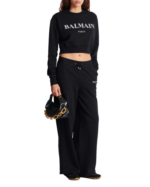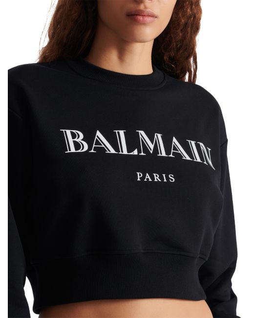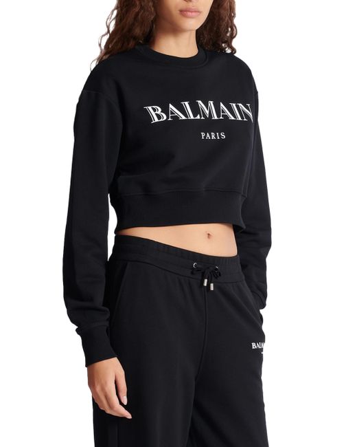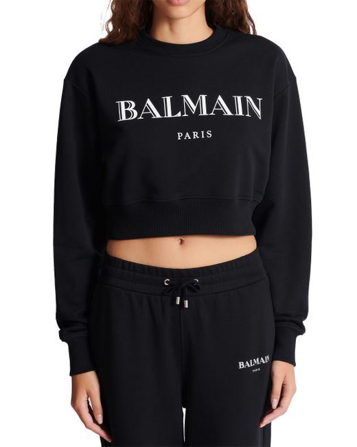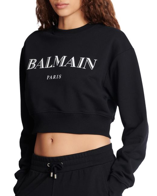 ONLY AT SAKS. Balmain's Capsule delivers elevated essentials crafted from premium cotton, combining everyday comfort with bold, signature branding. Relaxed silhouettes and vintage-inspired details bring a refined edge to classic streetwear staples. Cut for a cropped silhouette, this cotton jersey sweatshirt from Balmain features the label's logo printed across the chest. Dropped shoulder seams complete this style. Crewneck Long sleeves Rib-knit trim Pulls over 100% cotton Dry clean Imported SIZE & FIT Model measurements: 5'10" tall Model is wearing a US size Small Please note: This item runs small. ABOUT THE BRAND In 1945, founder Pierre Balmain made his well-received debut of opulent, ultra-feminine designs. Known today for its iconic blazers, impeccably constructed dresses and signature fragrances, the brand continues its dedication to masterful tailoring and elegance under the helm of Creative Director Olivier Rousteing. Advanced Designer - Balmain > Balmain > Saks Fifth Avenue. Balmain. Color: Black White. Size: Large.